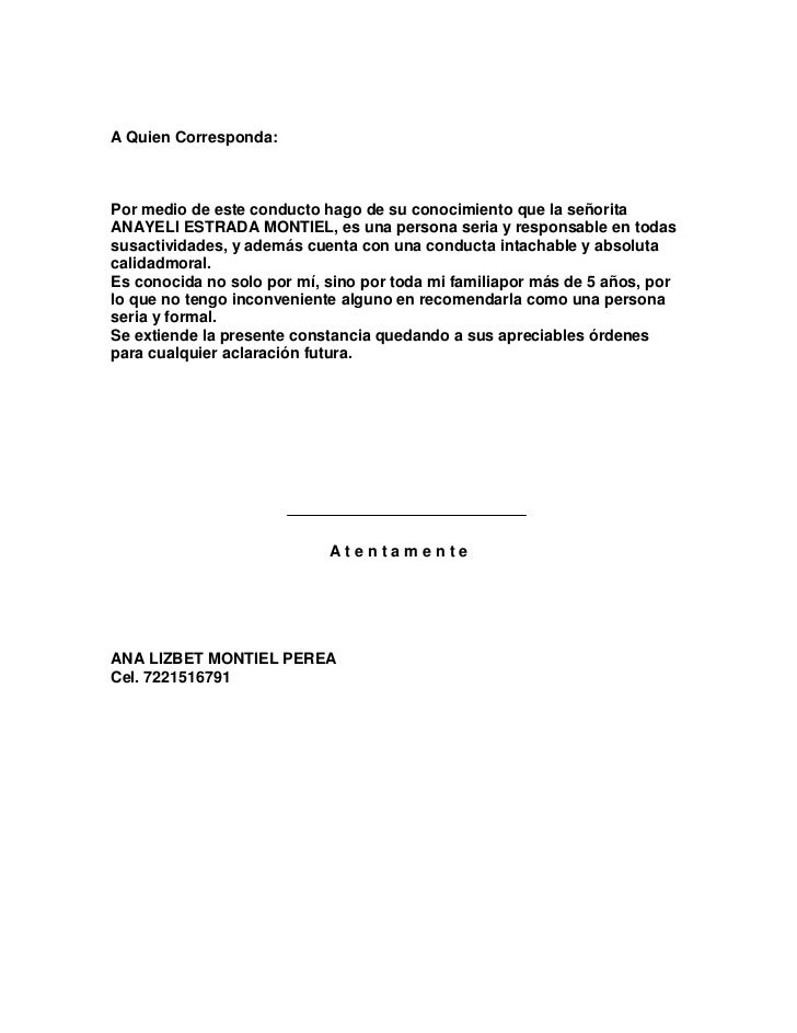 A QUIEN CORRESPONDA: “esta frase puede ser usada si . Debajo de los ejemplos explicamos qué es una carta de recomendación. Necesitas una recomendación , pero no tienes referencias profesionales . Tal vez unos cuantos ejemplos de cartas de recomendación personal puedan ayudar. Crea tu carta de recomendacion personal Online. JAHZEEL ALAMEDA . Se extiende la presente a solicitud del interesado, para los fines que a él le convengan. A quien corresponda: Por medio de la presente me permito recomendar ampliamente al Sr.